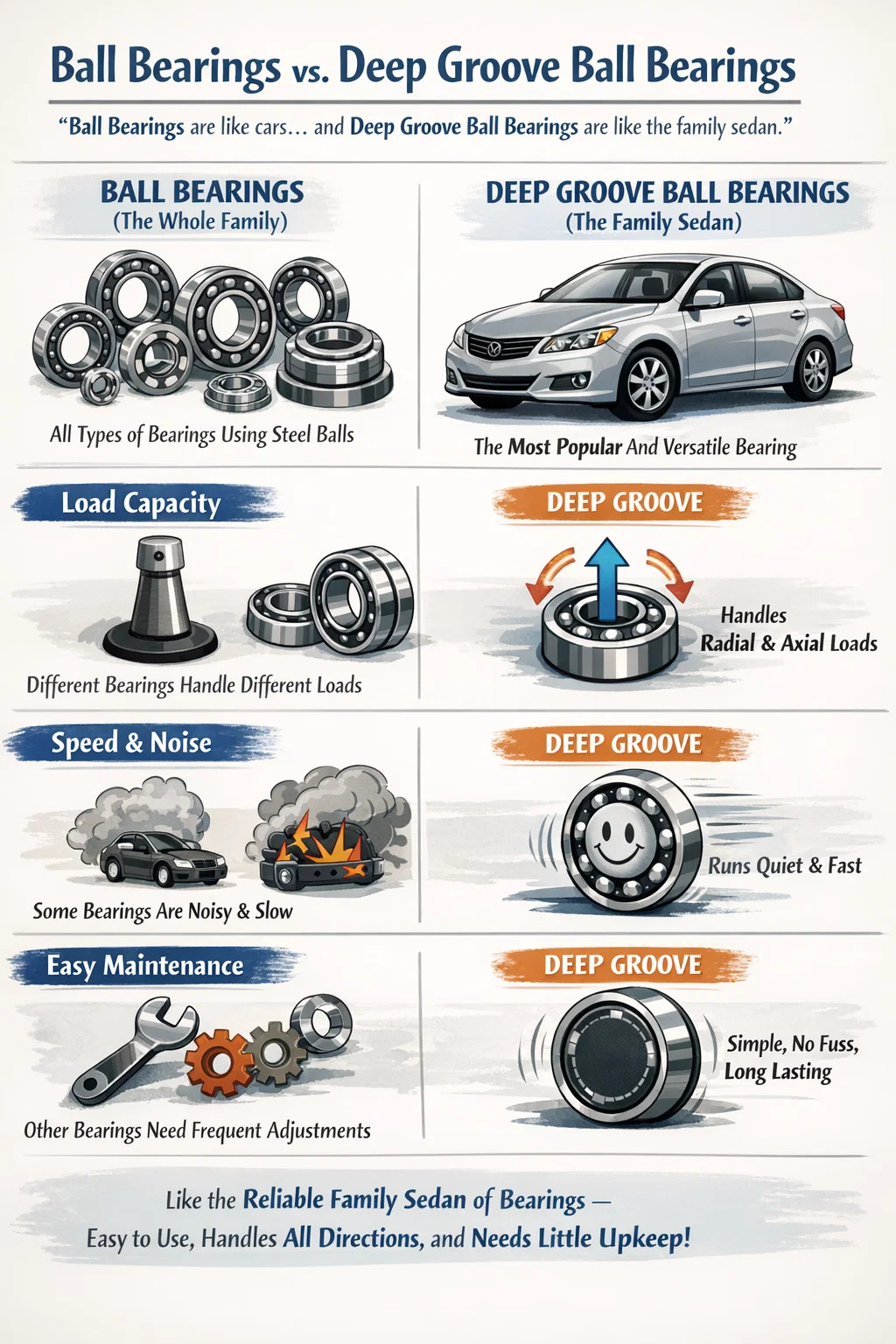 شما می توانید بلبرینگ را به عنوان "ماشین" در نظر بگیرید و بلبرینگ شیار عمیق به عنوان رایج ترین "سدان خانوادگی".